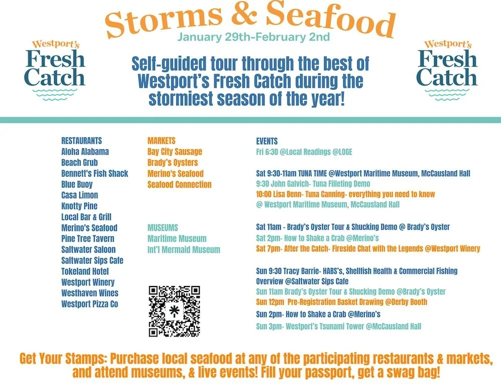 Westport Fresh Catch presents the Fourth Annual Storms and Seafood event. January 29- February 2, 2026. Passport Experience
