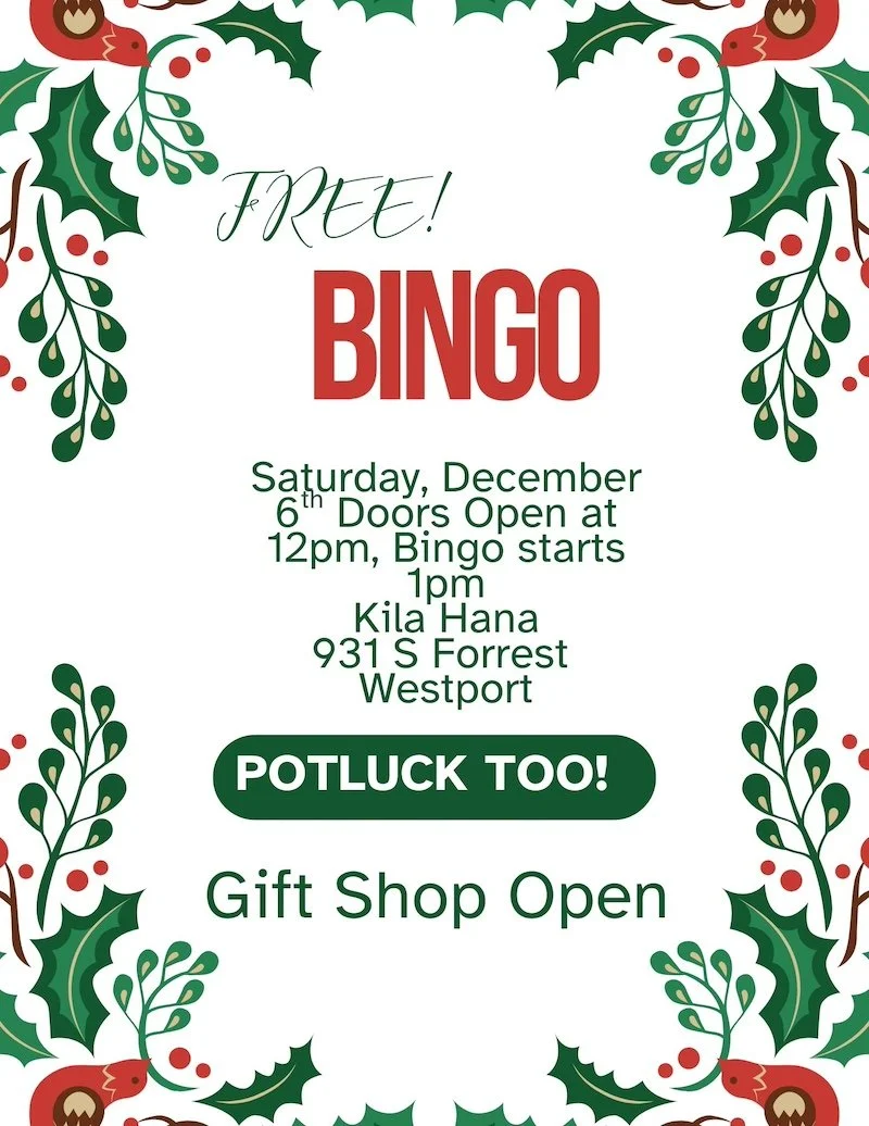 Free Bingo! Saturday, December 6, 2025 12:00 PM 4:00 PM Kila Hana Camperland 931 Forrest St Westport United States (map) Google Calendar ICS Come Enjoy Free Bingo and a Potluck Saturday Dec. 6 at Kila Hana. Doors open at 12PM and Bingo starts at 1pm. Bring a side dish and check out the gift shop! Questions? Call the office at 360-268-5036