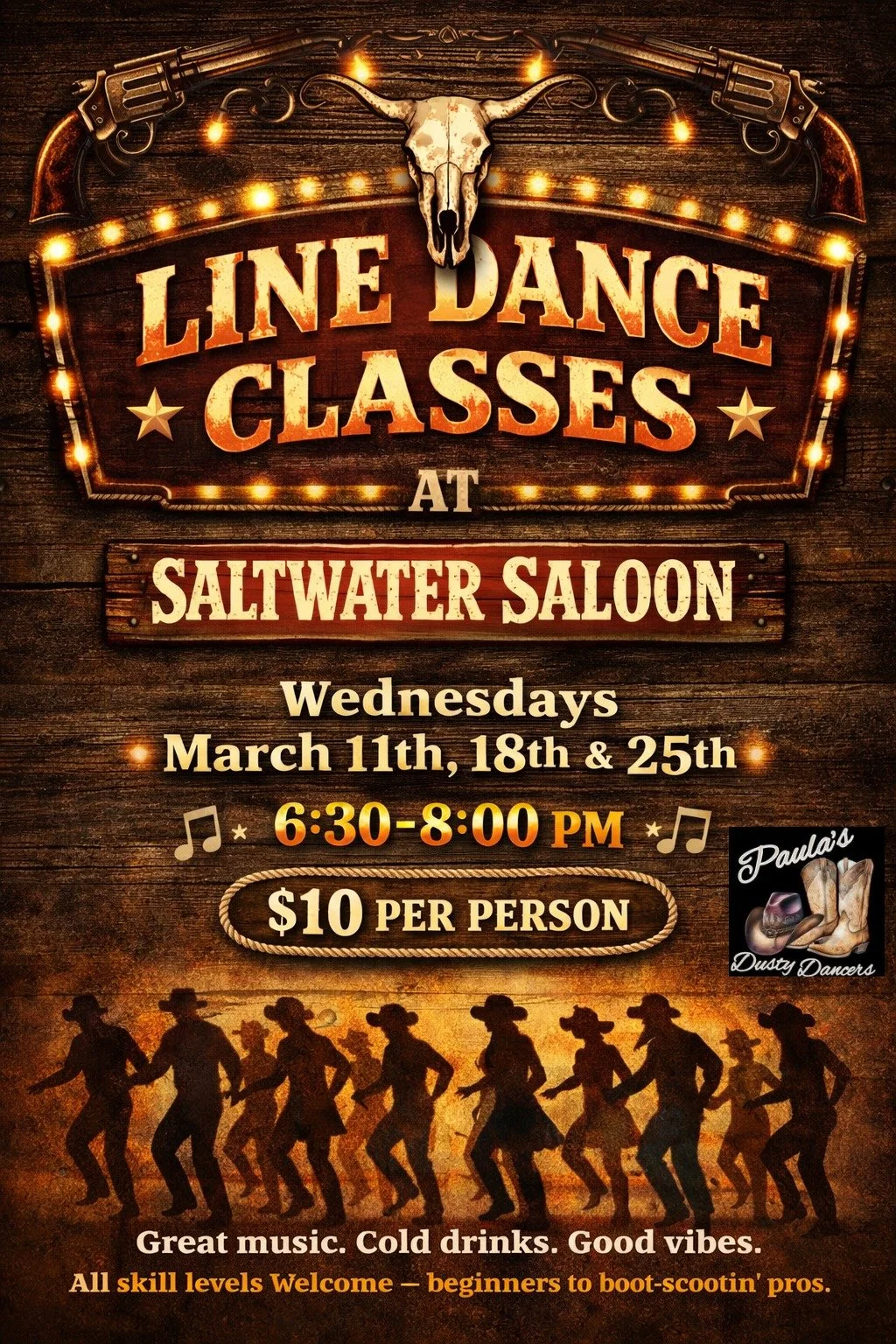 The Saltwater Saloon is hosting Line Dance Classes for three Wednesdays in March. March 11, 18, and 25th 6:30-8pm $10