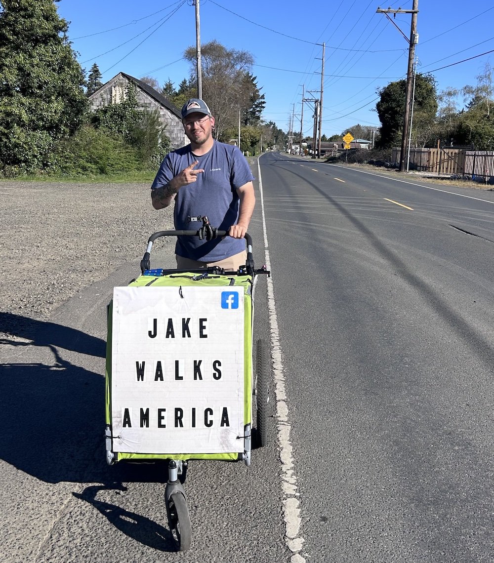 That discovery set off a chain of events that has shaped Jake’s life. He has walked back and forth across the United States, logging tens of thousands of miles. He has walked through every state except for Hawaii. There have been stretches of work along the way, but also hard times. Jake wrote his first book, Walking America, a 10,000 Mile Journey of Self Healing, while living in the woods behind a hospital in Tennessee. He published a second book, Walking America 2- The Journey Continues, last September, and has dreams of creating a nonprofit campground for veterans with PTSD. His Facebook page, Jake Walks America, is where he blogs about his journey. He has 97,000 followers and, from all the comments, a remarkable support network.